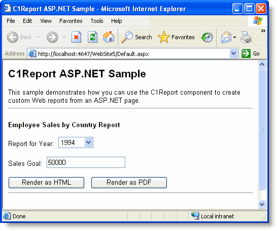 The example that follows is a simple ASP.NET page that allows users to enter some information and to select the type of report they want. Based on this, the ASP code creates a custom version of the NorthWind "Employee Sales by Country" report and presents it to the user in the selected format.