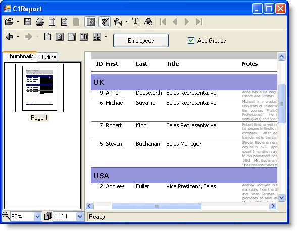 Useful reports don't simply show data, they show it in an organized manner. C1Report uses groups to group and sort data. To demonstrate how this works, return to the Creating a Report Definition topic's code and group the employees by country.
