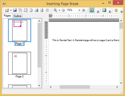 To insert a page break, use the BreakAfter property for the RenderObject.