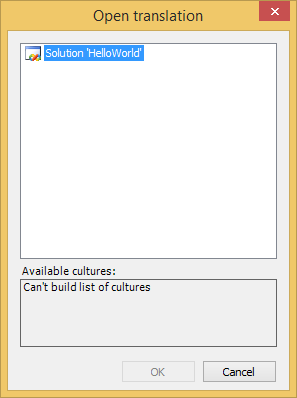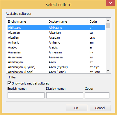 Initially the list contains neutral cultures only. To show all cultures, uncheck the Show only neutral cultures checkbox. You can use the English name, Display name, and Code boxes to filter the list of shown cultures. After you have selected a culture, press the OK button to add it to the translations. The newly added culture will appear in the Culture drop-down in the toolbar, and will become current in the window.