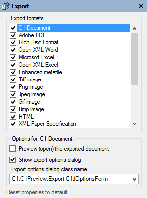 Clicking the Export button opens the Export dialog box where you can set export options. The default is checked for all formats.