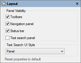 Clicking the Layout button opens the Layout dialog box where you can hide or show the preview control panels. The default is checked for Toolbars, Navigation panel, and Status bar.