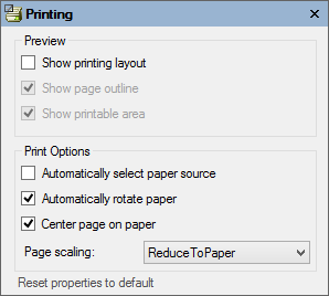 Clicking the Printing button opens the Printing dialog box where you can set printing options. Below are the default settings.