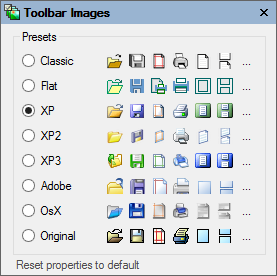 Clicking the Toolbar Images button opens the Toolbar Images dialog box where you can select from preset toolbar images. The default preset is XP.