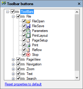 Clicking the Toolbar Buttons button opens the Toolbar Buttons dialog box where you can hide or show toolbars and buttons. The default is checked for all toolbars and buttons.