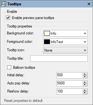 Clicking the Tooltips button opens the Tooltips dialog box where you can customize the settings for the preview pane tooltips. Below are the default settings.