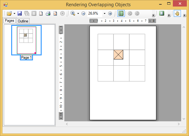 You can easily render overlapping objects in a table cell. For example, add the following code to the Form_Load event before the Generate method to add a square overlapped by two crossing lines in the table: