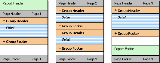 The next sections are the Group Headers, Detail, and Group Footers. These are the sections that contain the actual report data. Group Headers and Footers often contain aggregate functions such as group totals, percentages, maximum and minimum values, and so on. Group Headers and Footers are inserted whenever the value of the expression specified by the GroupBy property changes from one record to the next.