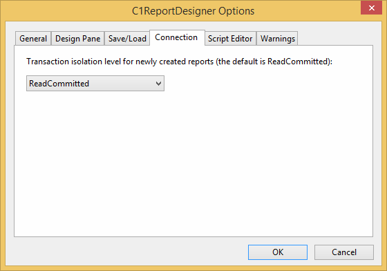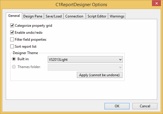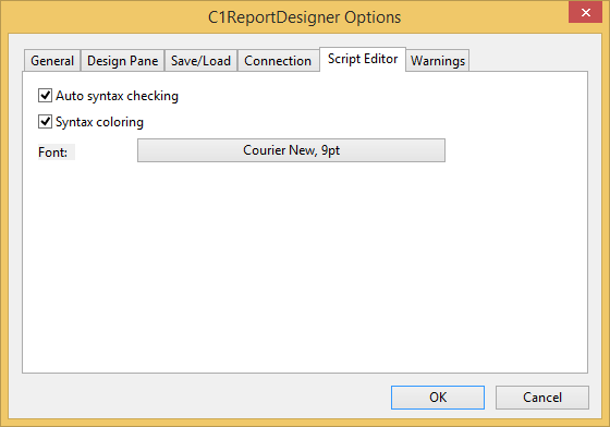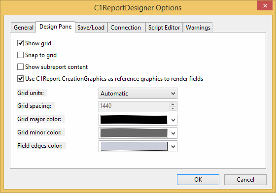 In each of the above tabs, clicking OK saves the changes and clicking Cancel cancels any changes that you have made in the C1ReportDesigner Options dialog box.