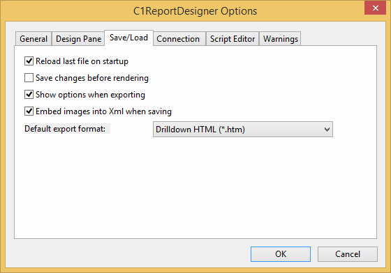 - Reload last file on startup: If this option is checked, the last opened file will appear whenever the C1ReportDesigner application is opened.
