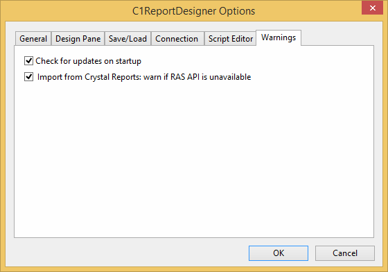 - Import from Crystal Reports: warn if RAS API is unavailable: Checking this option throws warning if RAS API is unavailable while importing Crystal Reports in C1ReportDesigner.