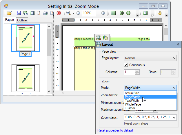 To set the initial zoom mode, set the ZoomMode property to ActualSize, PageWidth, TextWidth, WholePage (default), or Custom. This property can be set at either in the designer or in code.
