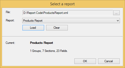 To load a report definition from a file at design time, complete one of the following tasks: