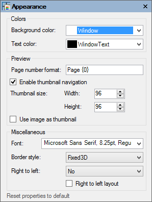 Clicking the Appearance button opens the Appearance dialog box where you can set the colors, thumbnail settings, and font of the Thumbnail view.