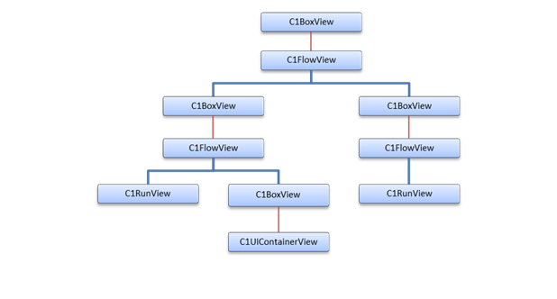 When C1RichTextBox creates the C1Document layout, it creates a parallel tree composed of C1TextElementView objects. For each C1TextElement in the C1Document tree, there is at least one C1TextElementView that is tasked with its layout and drawing.