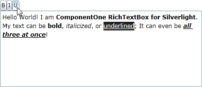 <Window xmlns:c1="http://schemas.componentone.com/winfx/2006/xaml" x:Class=" C1RichTextBoxIntro.MainWindow" xmlns="http://schemas.microsoft.com/winfx/2006/xaml/presentation" xmlns:x="http://schemas.microsoft.com/winfx/2006/xaml" Title="MainWindow"> <Grid x:Name="LayoutRoot" Background="White"> <Grid.RowDefinitions> <RowDefinition Height="Auto" /> <RowDefinition /> </Grid.RowDefinitions> <StackPanel Orientation="Horizontal" > <ToggleButton x:Name="_btnBold" Content="B" Click="_btnBold_Click" Checked="_btnBold_Click" /> <ToggleButton x:Name="_btnItalic" Content="I" Click="_btnItalic_Click" /> <ToggleButton x:Name="_btnUnderline" Content="U" Click="_btnUnderline_Click" /> </StackPanel> <c1:C1RichTextBox x:Name="_rtb" Grid.Row="1" AcceptsReturn="True" SelectionChanged="_rtb_SelectionChanged"/> </Grid> |