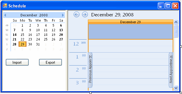 In the following example, C1Calendar and C1Schedule controls are added to the form along with Import and Export buttons. When the application is run, you'll be able to import and export data into the C1Schedule control.
