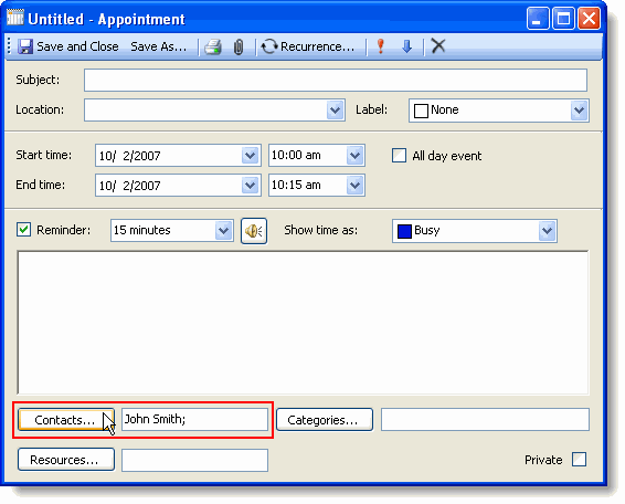 At run time, assigning a contact or contacts to an appointment can be done through the Contacts dialog box. Clicking the Contacts button in the Appointment dialog box opens the Contacts dialog box.