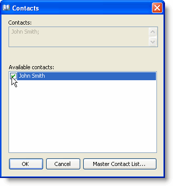 Note: By default, the Contacts dialog box does not contain any contacts. For information on how to add contacts to the Contacts dialog box, see Adding Contacts to the Master Contact List. |