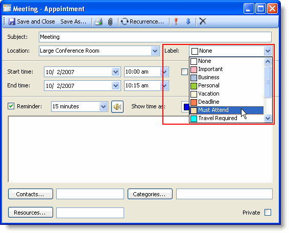 At run time, the label can be set in the Appointment dialog box by setting the Label drop-down arrow and selecting one of the available options. In the image below the Must Attend label is selected: