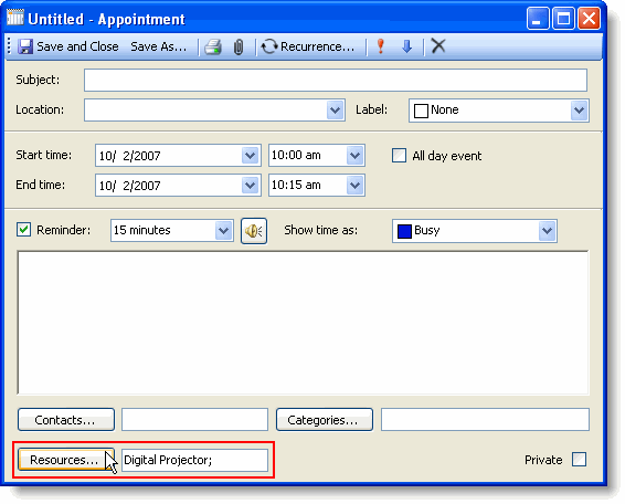 Assigning a resource can be done through code. The following code, added to the Form_Load event, creates a Digital Projector resource and assigns it to the appointment: