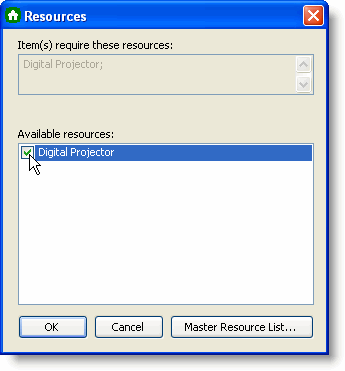 Note: By default, the Resources dialog box does not contain any resources. For information on how to add resources to the Resources dialog box, see Adding Resources to the Master Resource List. |