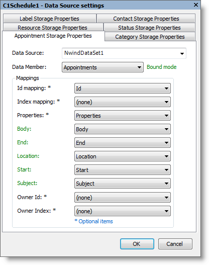 All objects in the Scheduler for WinForms' object model are identified by either Id or Index property. To allow data to be correctly restored from your data sources you should specify mapping either for the IdMapping or IndexMapping properties, which makes sense if you bind to your data storages of Resources, Labels, Contacts or Categories. C1Schedule saves only Ids or Indexes of these objects in the AppointmentStorage. If there is no mapping for IdMapping or IndexMapping, C1Schedule will not be able to identify the appointment's properties correctly in storages initialized by your data.