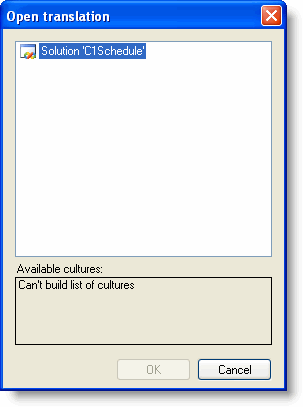 Clicking the Open button opens an existing translation for a particular assembly. All translations that you create are stored as .resx files and are automatically added to the project that you select while saving the translation. Clicking this item shows a dialog box where a previously saved translation can be selected.
