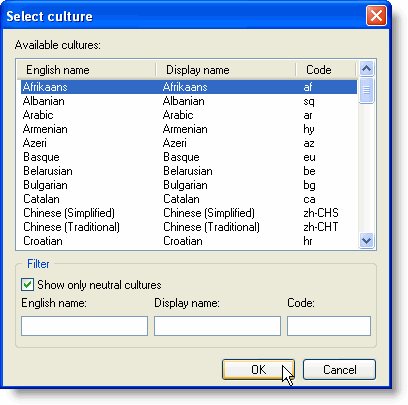 Initially the list contains neutral cultures only. To show all cultures, uncheck the Show only neutral cultures checkbox. You can use the English name, Display name, and Code boxes to filter the list of shown cultures. After you have selected a culture, press the OK button to add it to the translations. The newly added culture will appear in the Culture drop-down in the toolbar and will become current in the window.