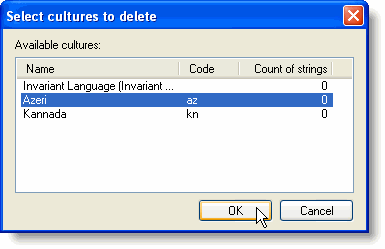 Clicking the Delete culture button removes a culture from the translations. The Select cultures to delete dialog box provides the list of cultures existing in the translations:
