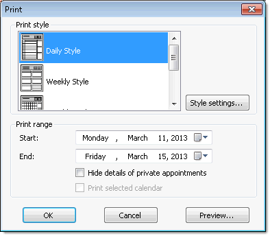 Note: If users select a specific appointment to print (right-click the appointment and select Print or Print Preview) the print range will not be visible and cannot be changed in the Print dialog box. |