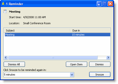 Appointment reminders display a Reminder dialog box at a specified time before the appointment occurs. In the Reminder dialog box, you have the option of dismissing one or more appointments (if multiple appointments are due), opening the item, or resetting the reminder to appear again in a set amount of time.