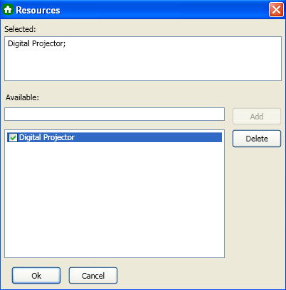 The new resource appears in the Resources dialog box when the Resources button is clicked in the Appointment dialog box: