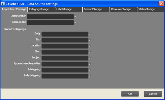 <c1:C1Scheduler Margin="0,0,-80,-80" Theme="{DynamicResource {ComponentResourceKey ResourceId=Office2007.Blue, TypeInTargetAssembly={x:Type c1sched:C1Scheduler}}}"> <c1:NestedPropertySetter PropertyName="DataStorage.AppointmentStorage.DataMember" Value="Appointments"/> <c1:NestedPropertySetter PropertyName="DataStorage.AppointmentStorage.DataSource" Value="{DynamicResource dataSet}"/> <c1:NestedPropertySetter PropertyName="DataStorage.AppointmentStorage.Mappings.Body.MappingName" Value="Body"/> <c1:NestedPropertySetter PropertyName="DataStorage.AppointmentStorage.Mappings.End.MappingName" Value="End"/> <c1:NestedPropertySetter PropertyName="DataStorage.AppointmentStorage.Mappings.Location.MappingName" Value="Location"/> <c1:NestedPropertySetter PropertyName="DataStorage.AppointmentStorage.Mappings.Start.MappingName" Value="Start"/> <c1:NestedPropertySetter PropertyName="DataStorage.AppointmentStorage.Mappings.Subject.MappingName" Value="Subject"/> <c1:NestedPropertySetter PropertyName="DataStorage.AppointmentStorage.Mappings.AppointmentProperties.MappingName" Value="Properties"/> <c1:NestedPropertySetter PropertyName="DataStorage.AppointmentStorage.Mappings.IdMapping.MappingName" Value="Id"/> <c1:NestedPropertySetter PropertyName="DataStorage.AppointmentStorage.Mappings.IndexMapping.MappingName" Value="N/A"/> <c1:C1Scheduler> |
