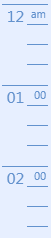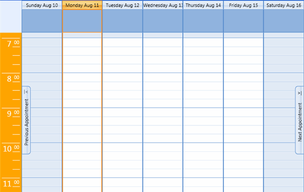 To customize the time column of a C1Scheduler control, you can edit the built-in C1Scheduler_TimeRuler_Template. In the following examples, we will edit the TimeRuler datatemplate to change the way the time appears in the time column and to change the background color of the time column.