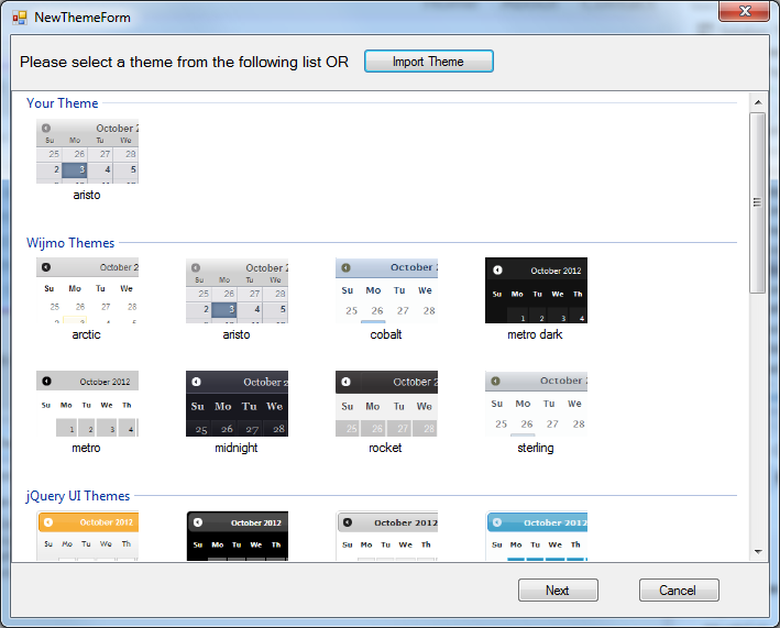 - When ThemeRoller for Visual Studio launches, choose a theme from the NewThemeForm to begin with that resembles what you want as your end product. This will save you time when you're rolling your theme: