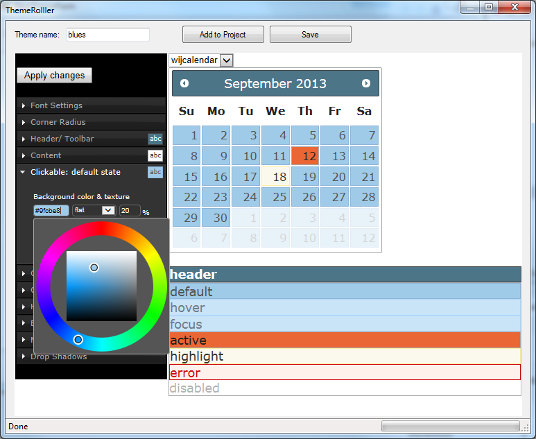 - When you've completed customizing your theme, click Add to Project. ThemeRoller will add the theme to your project and reference it for you. When you see your theme in your project, you can close ThemeRoller.