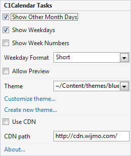 Note that now the theme you created in ThemeRoller is in the Theme drop-down, and the Customize Theme item has been added to the C1Calendar Tasks menu. You can click that to edit or further customize the theme you created.