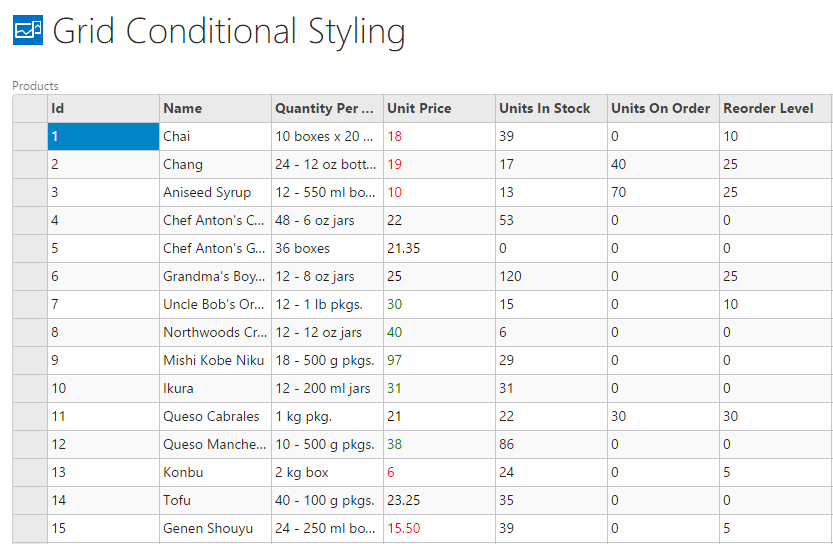 The following image shows how the FlexGrid appears after using itemFormatter property to categorize Unit Price column. This displays values that are less than 20 in red; and more than 30 in green. The example uses DemoServiceData.Products data from http://lsdemo.componentone.com/DataServices/Demo.svc.