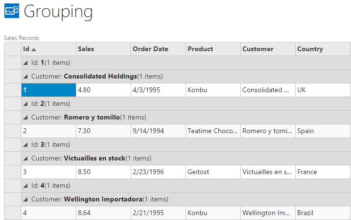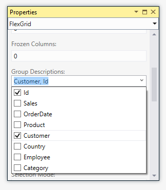 You can set these properties in the designer through the Properties window. The example below demonstrates how to enable Grouping in FlexGrid using DemoServiceData.SalesRecords data from http://lsdemo.componentone.com/DataServices/Demo.svc.