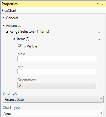 You can set these properties in the designer through the Properties window. The example below demonstrates how to enable Range Selector in FlexChart using the data ApplicationData.FinanceDatas from the local database file ApplicationData.mdf.