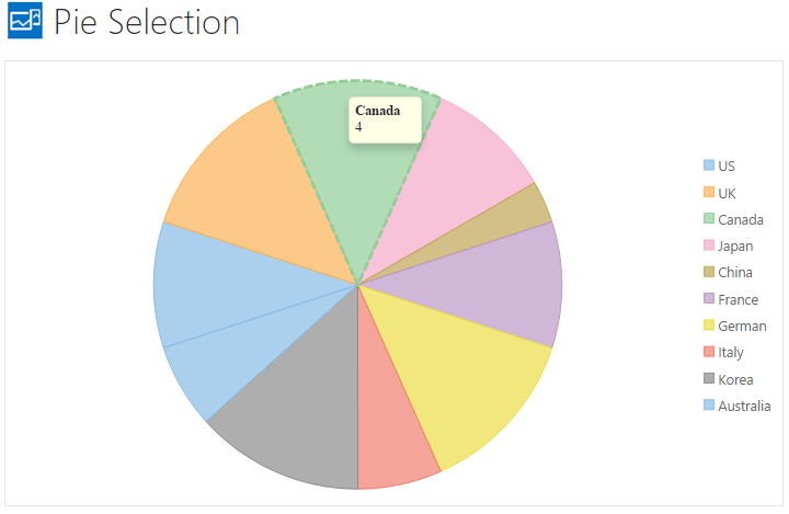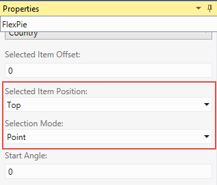 You can set these properties in the designer through the Properties window. The example below demonstrates how to enable Selection in FlexPie using ApplicationData.CountrySales data from the local database file ApplicationData.mdf.