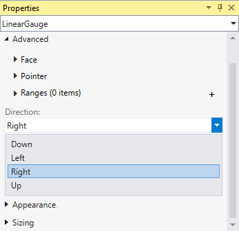 You can set these properties in the designer through the Properties window. The example below demonstrates how to enable Direction in LinearGauge using ApplicationData.Fruits data from the local database file ApplicationData.mdf.