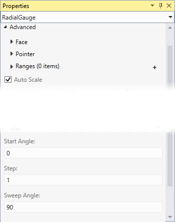 You can set these properties in the designer through the Properties window. The example below demonstrates how to enable AutoScaling in RadialGauge using ApplicationData.Fruits data from the local database file ApplicationData.mdf.