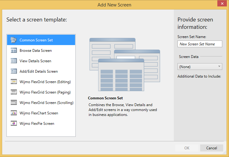 On adding Wijmo 5 FlexGrid for Cloud Business App as Extensions in your project, following additional screen templates will be added to the application: