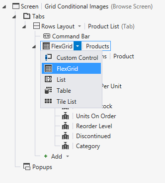 Screen templates for some wijmo 5 based collection control extensions automatically integrate into the Add New Screen dialog, on installing Cloud Business App Edition. Whereas, value control extensions do not have screen templates, but are available in number fields within a particular screen. The image below shows a FlexGrid control added to the designer.