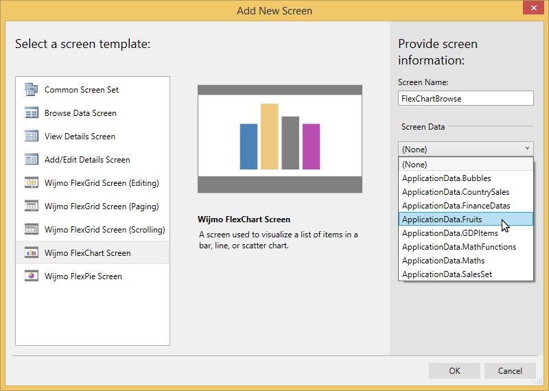 FlexChartBrowse) for the screen in Screen Name text box.The example uses data from local database file ApplicationData.mdf.
