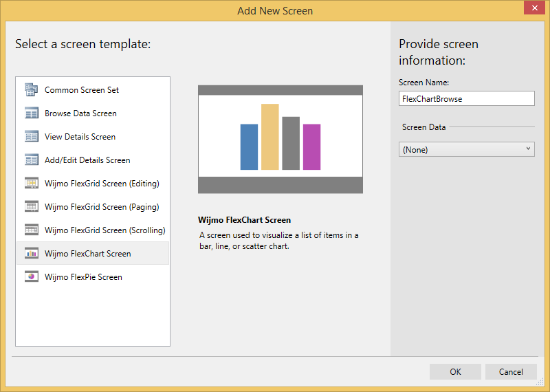 This section describes how to use Wijmo FlexChart Screen template and add data.