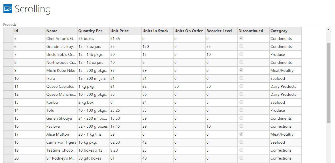 FlexGrid provides Wijmo FlexGrid Screen (Scrolling) screen template to enable scrolling in FlexGrid. Users can experience smooth scroll through large data sets without suffering any performance delay.