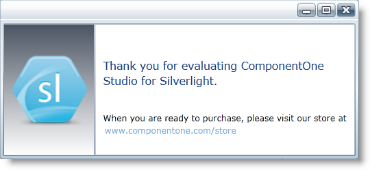 All ComponentOne products are designed to display licensing information at run time if the product is not licensed. None will throw licensing exceptions and prevent applications from running. Each time an unlicensed Silverlight application is run; end-users will see the following pop-up dialog box: